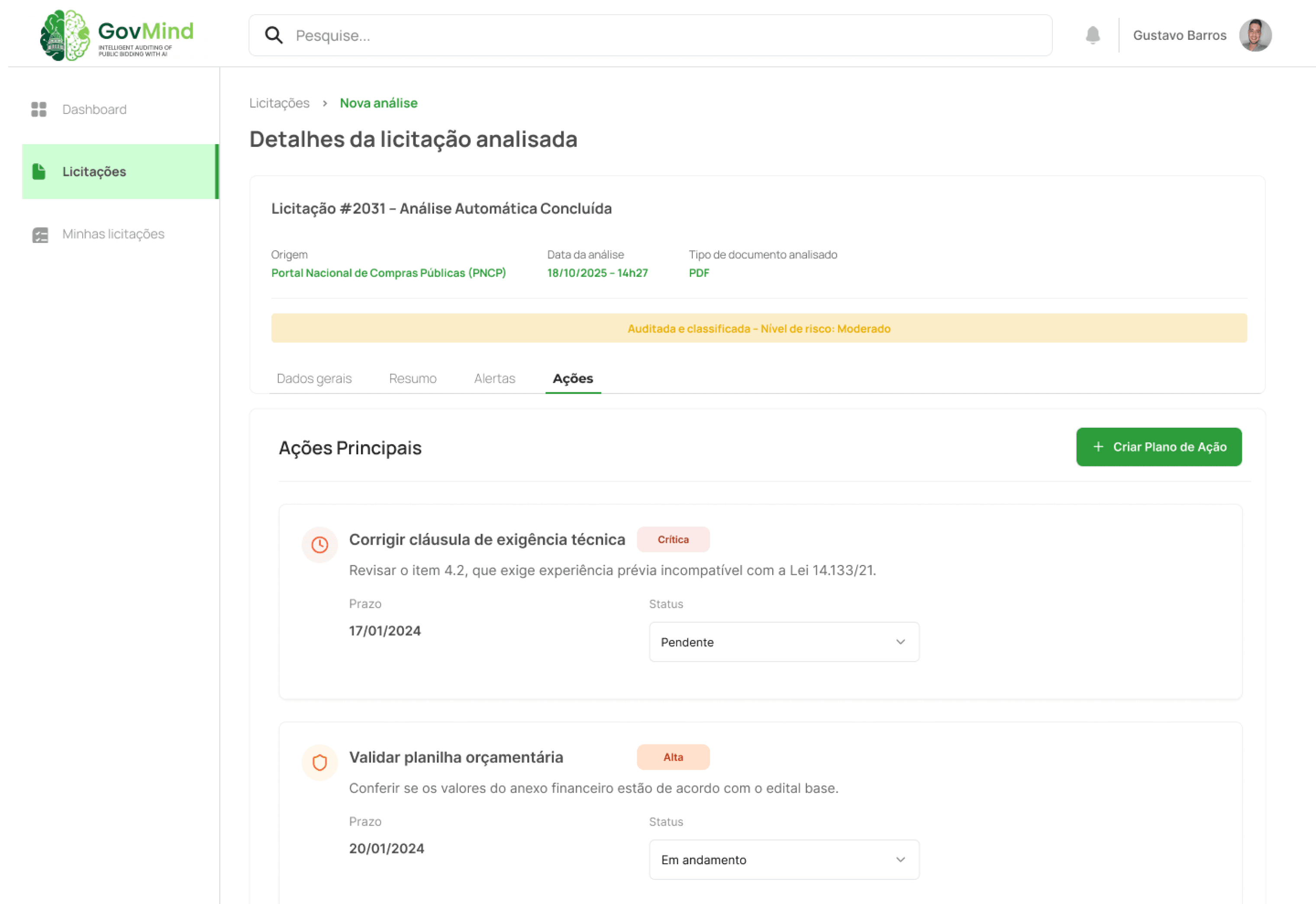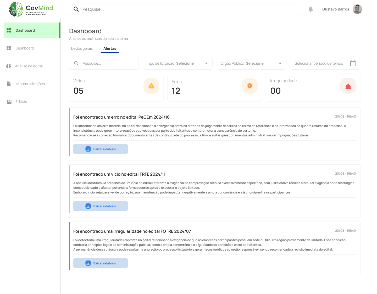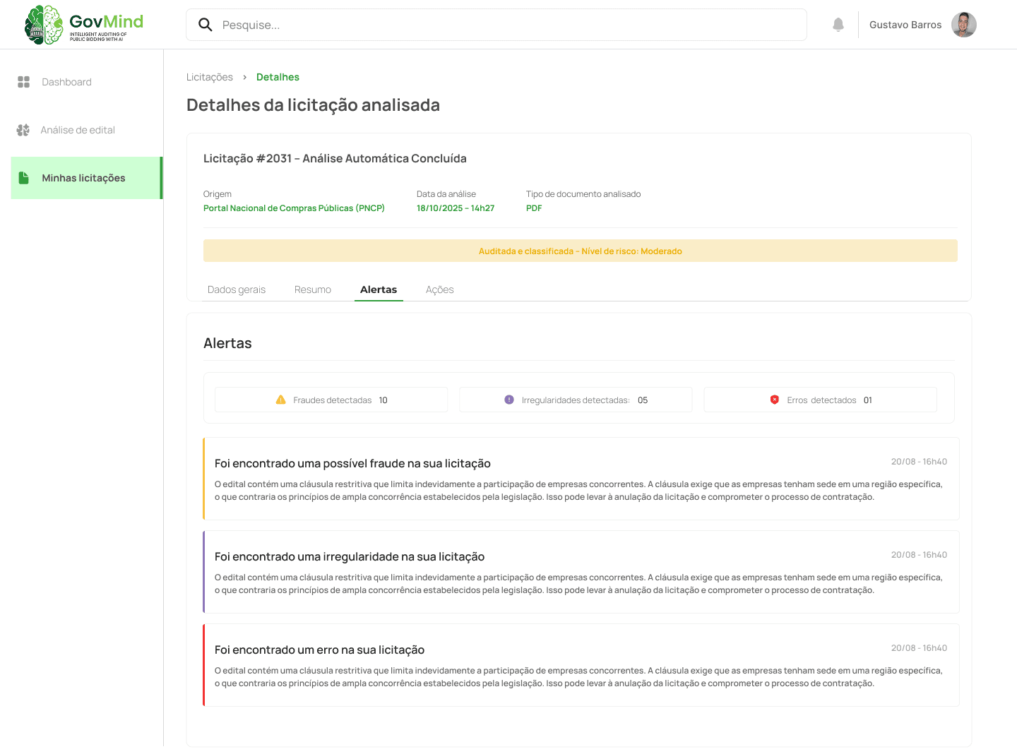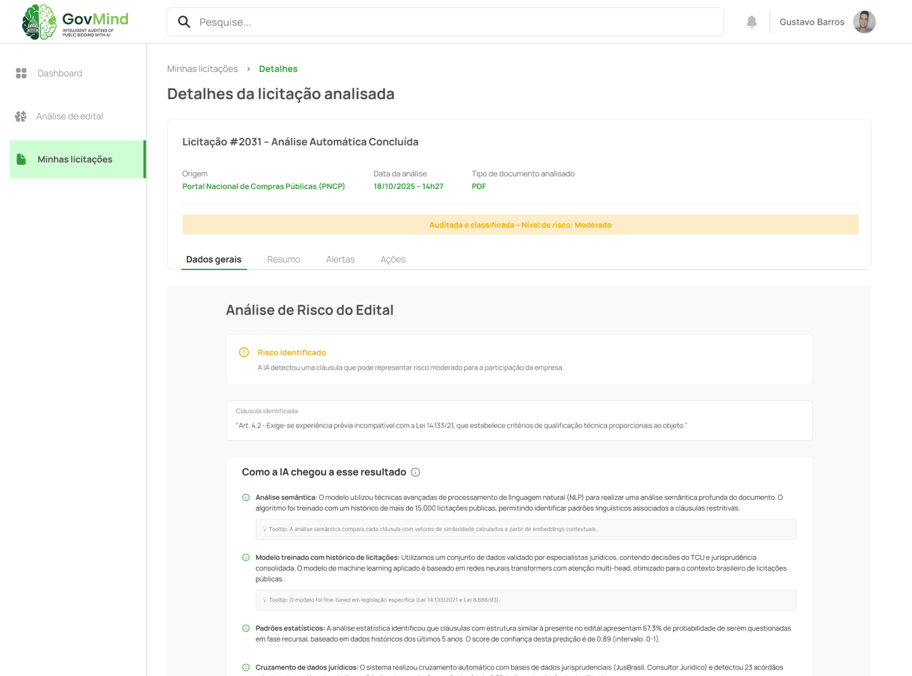 IA identifica cláusulas suspeitas baseada em jurisprudência do TCU. Cada alerta mostra trecho original,